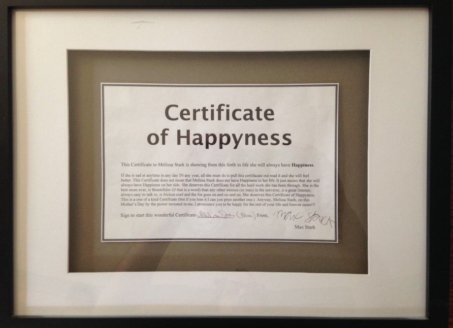 “She deserves this Certificate of Happyness. This is a one of a kind Certificate (but if you lose it I can just print another one:) Anyway, Melissa Stark, on this Mother’s Day by the power invested in me, I pronounce you to be happy for the rest of your life and forever more!!!”— excerpt 4 of 4